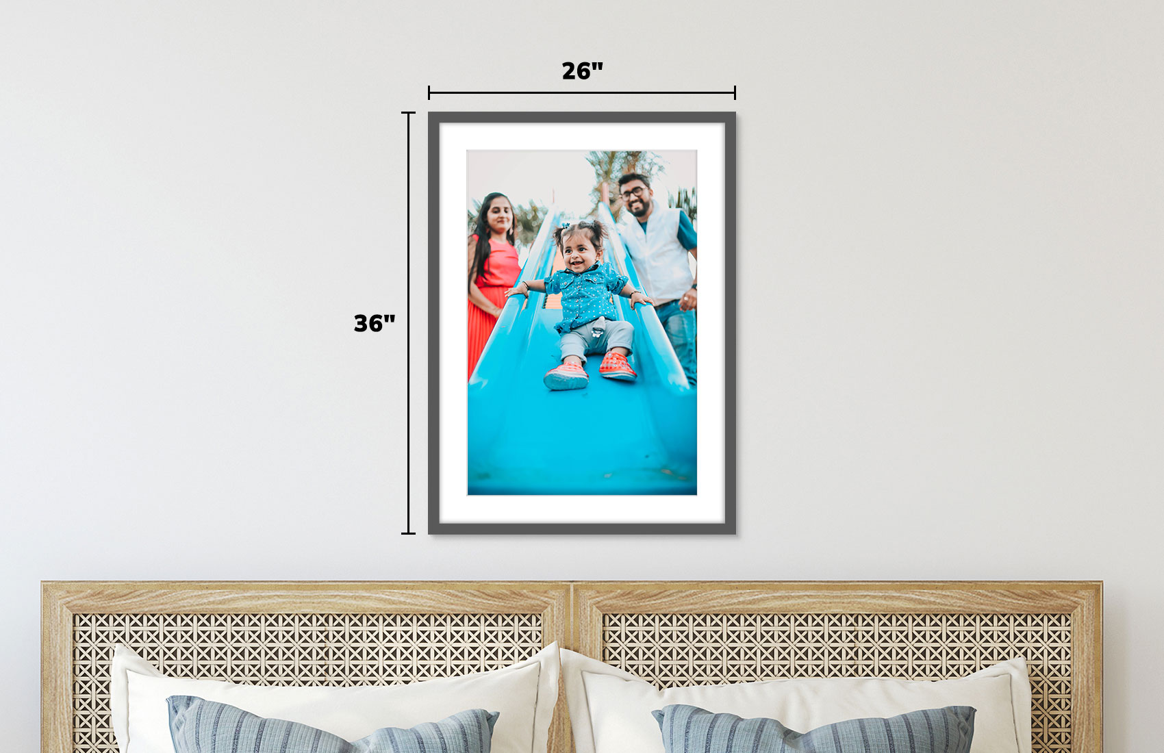 Classic gray frame with white matte, brings a touch of elegance and class to your décor. Wood frame includes your 20x30 print!